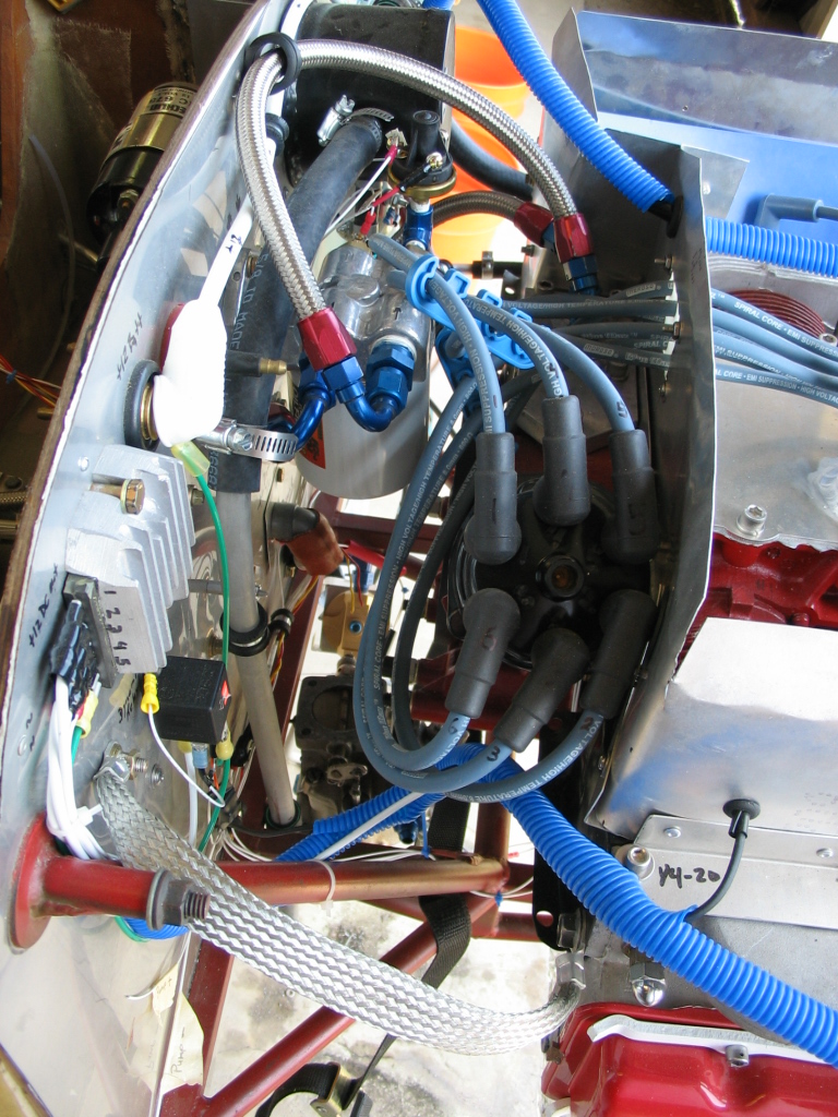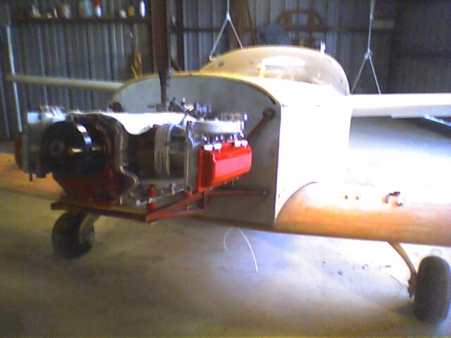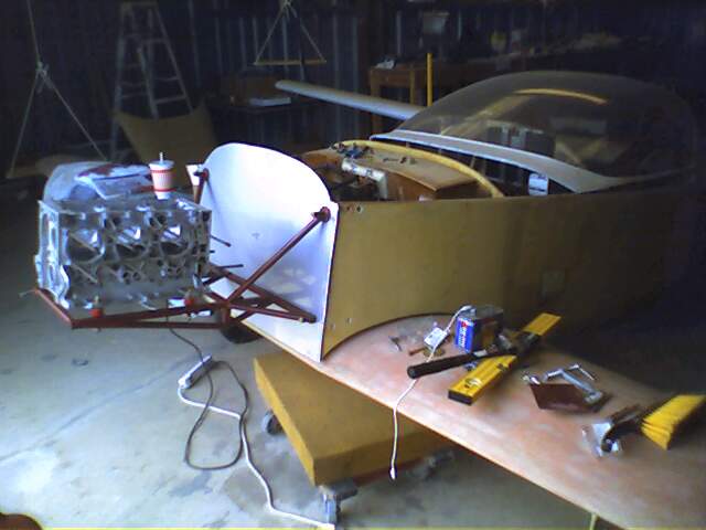 The Corvair is narrower than the VW, and will not need the *cheeks* like the VW powered Dragonflies do. Notice the clearance between the valve cover and the firewall edge.