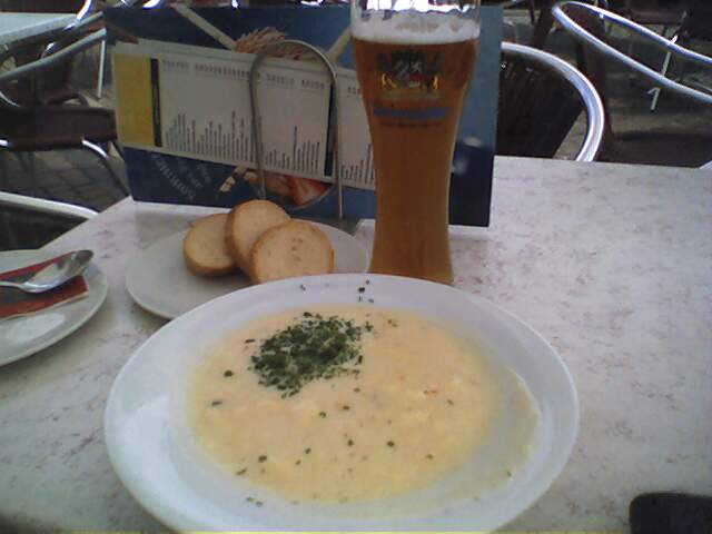 A real Karlsruhe lunch: Esparagus soup, bread, and beer