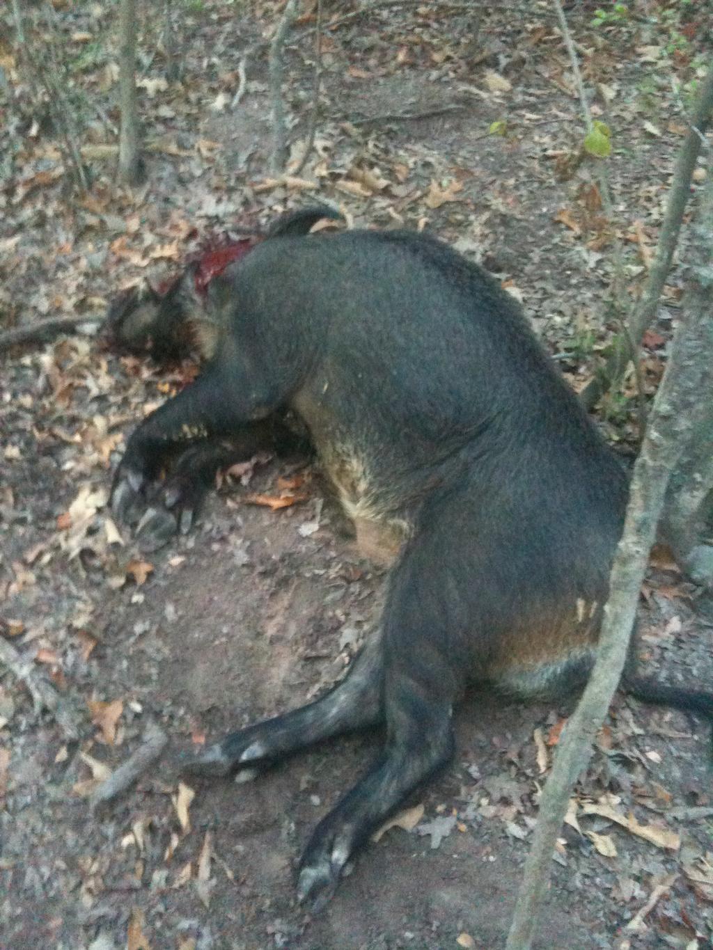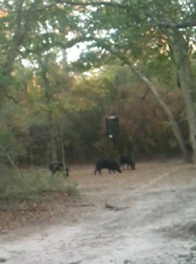 Three hogs eating corn off the ground under the feeder about 50 yards away from me