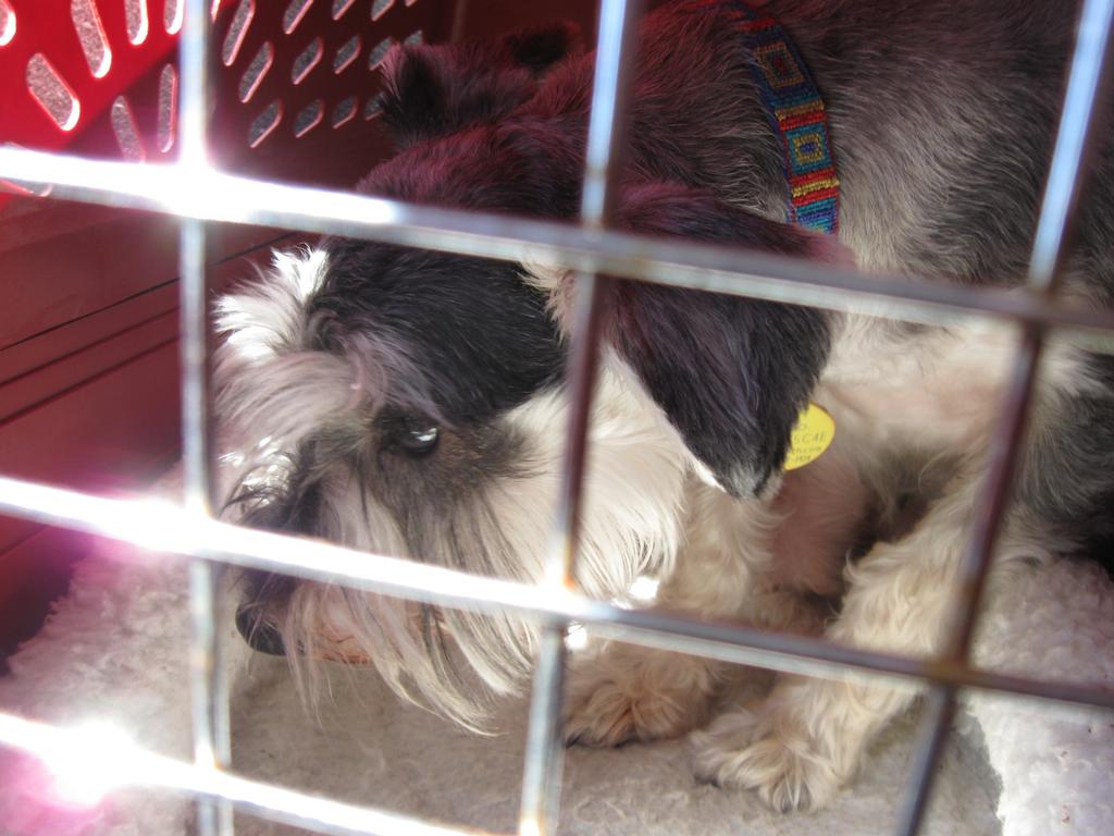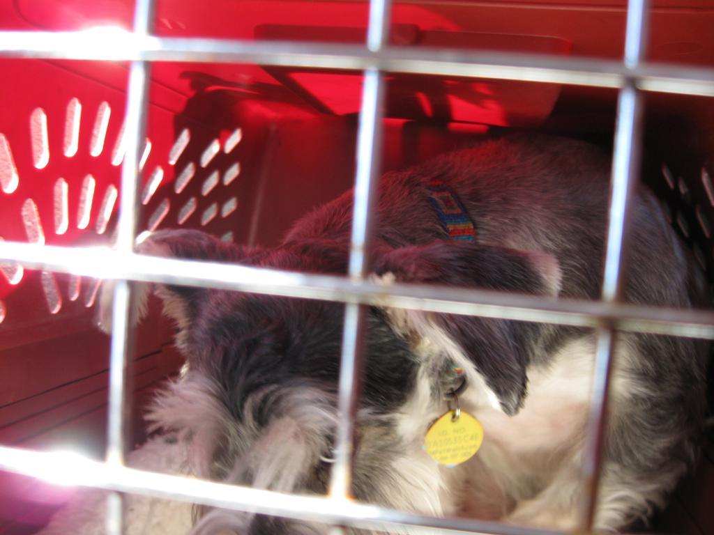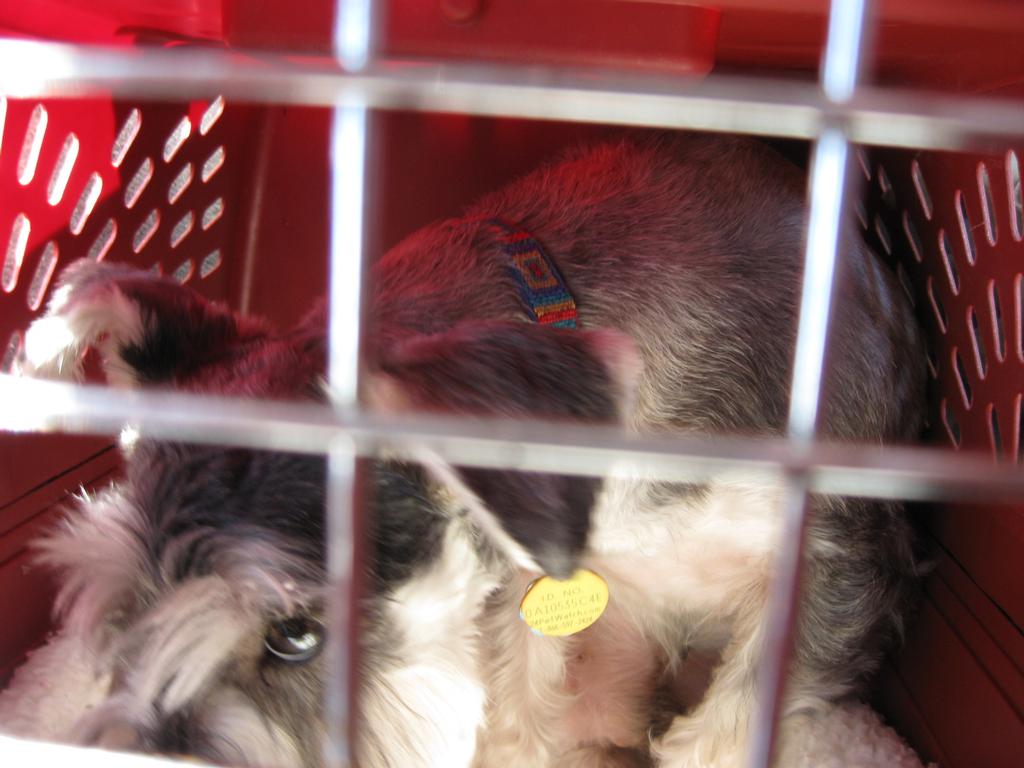 Ziggy in his crate in the back seat of the airplane.