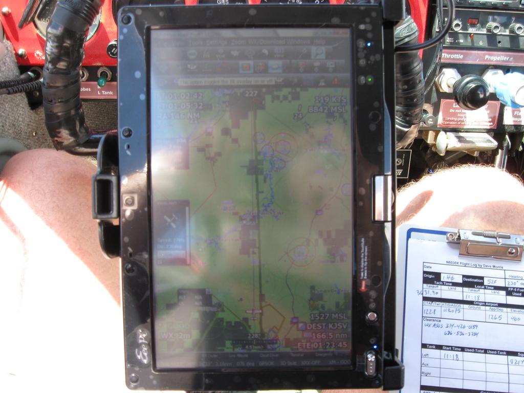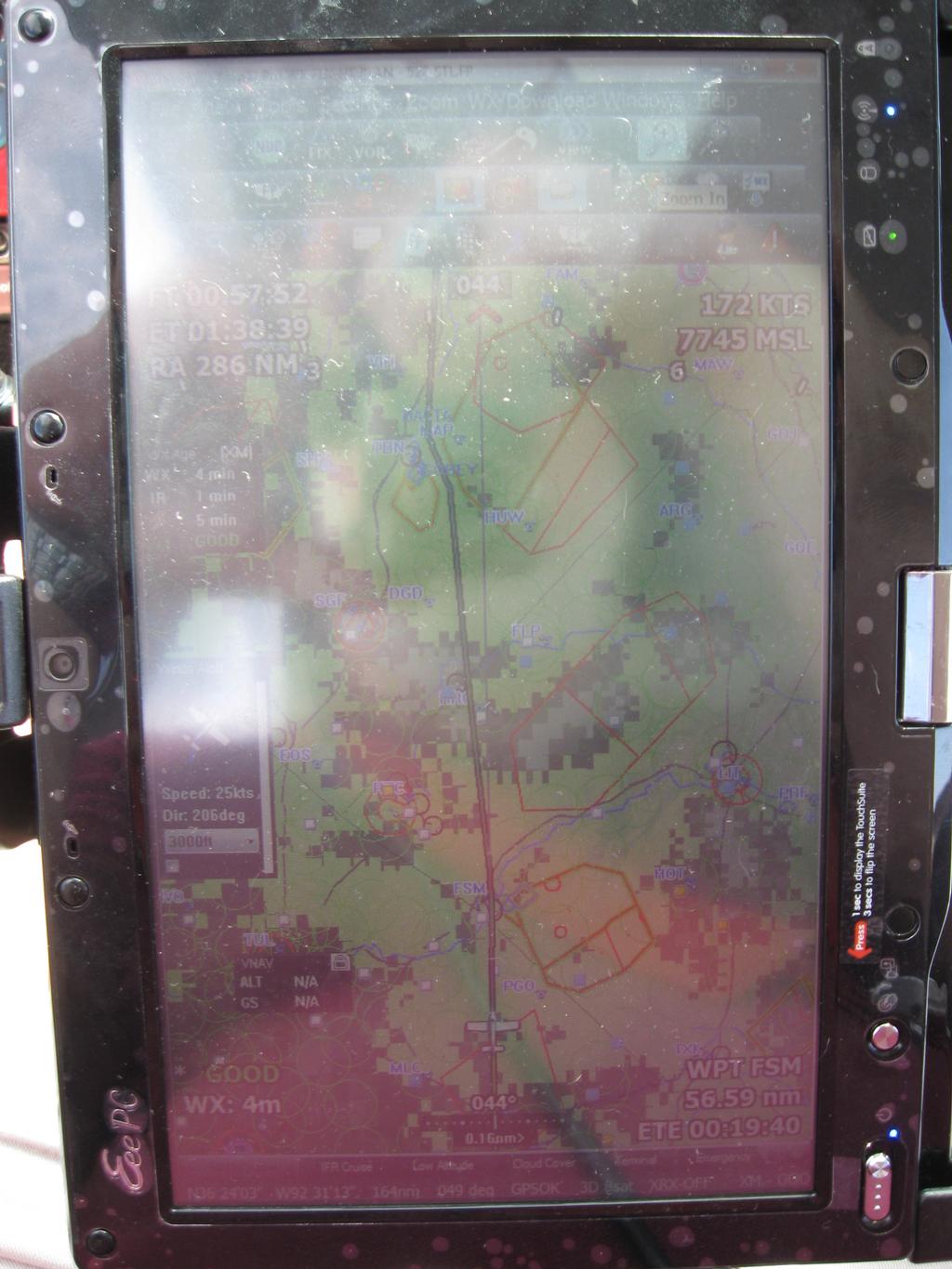 People ask me how I know where I am going. I have this tablet computer mounted on the control wheel, and it shows my airplane at the bottom, the path I'm going to fly, and all the airports, highways, lakes, and mountains around. In this photo I had turned on the Infrared Satellite picture so I could see where the clouds were. My Ground Speed is 172 kts, and I am 19 minutes from overflying Fort Smith, Arkansas.