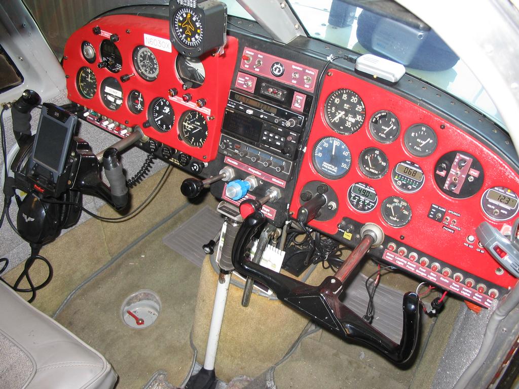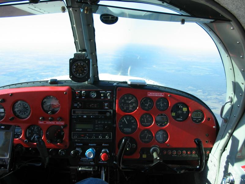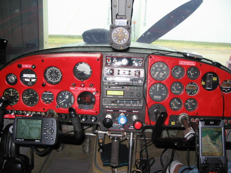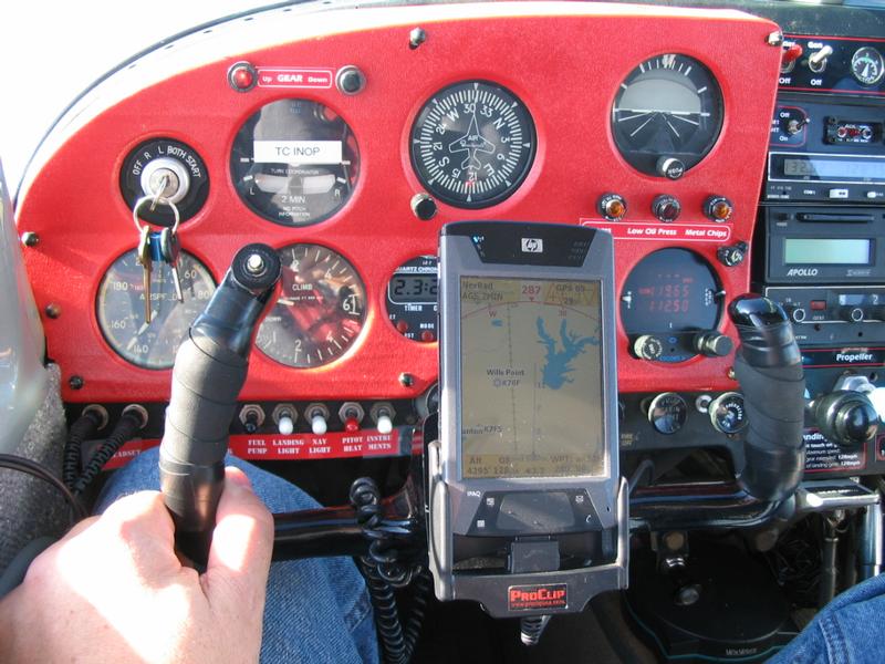 The well-appointed cockpit of 2008 in a 1960 airplane. You can see 2 of the 5 GPSes I normally have in flight. One GPS sits on the right side glareshield and talks to the HP Windows Mobile PDA on the yoke. Another one is in the Garmin GX-60 IFR-certified GPS/Comm in the center stack. Not visible here are my Spot Messenger, the APRS tracking device, and my ATT Tilt smartphone that is also running an emergency backup copy of AnywhereMap.