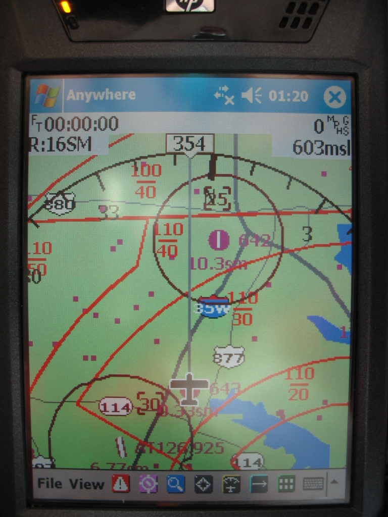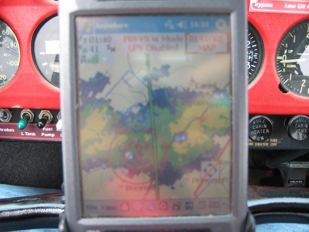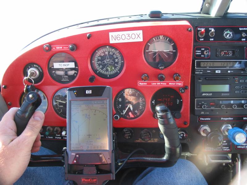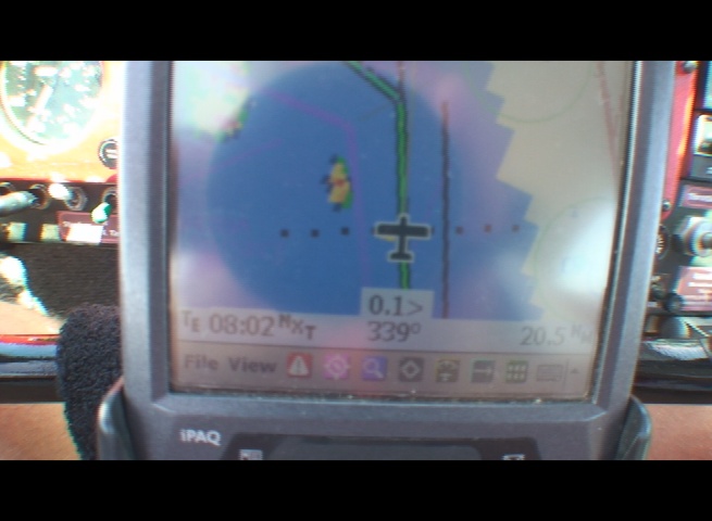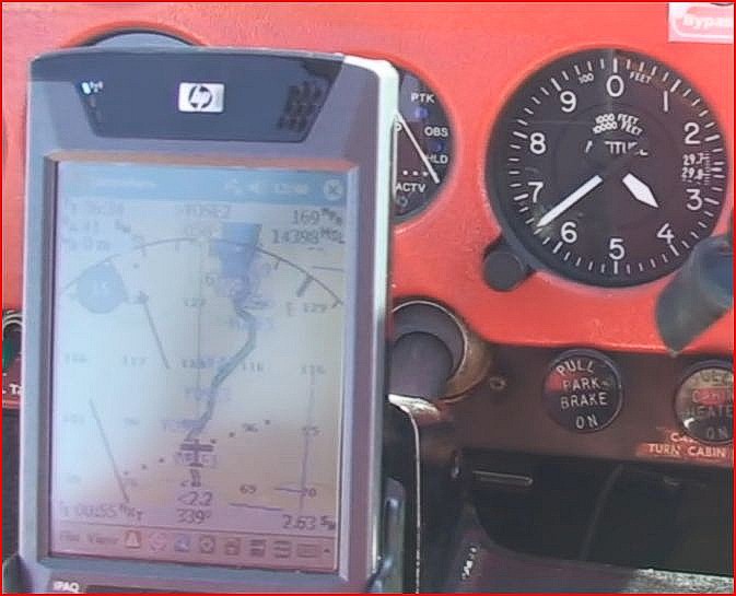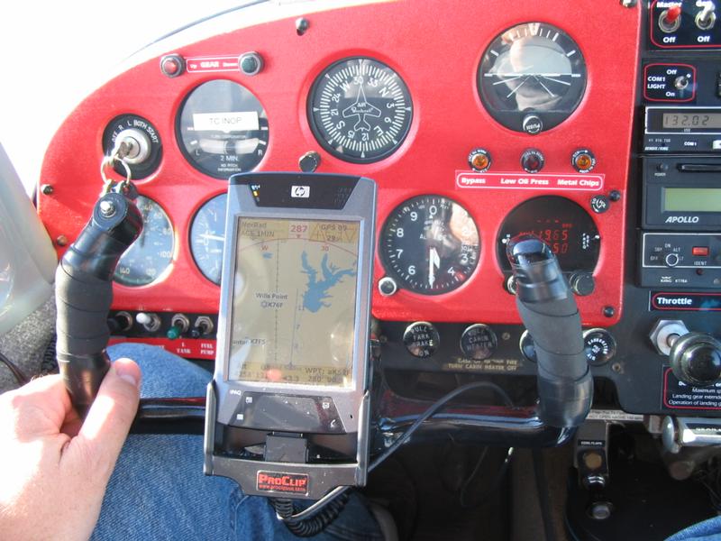 I am now using AnywhereMap Wx on the HP iPaq 4705 PDA running Windows Mobile, and it works fantastically! To the right you can see the panel-mounted old Apollo 820 LORAN I used to have in the cockpit.