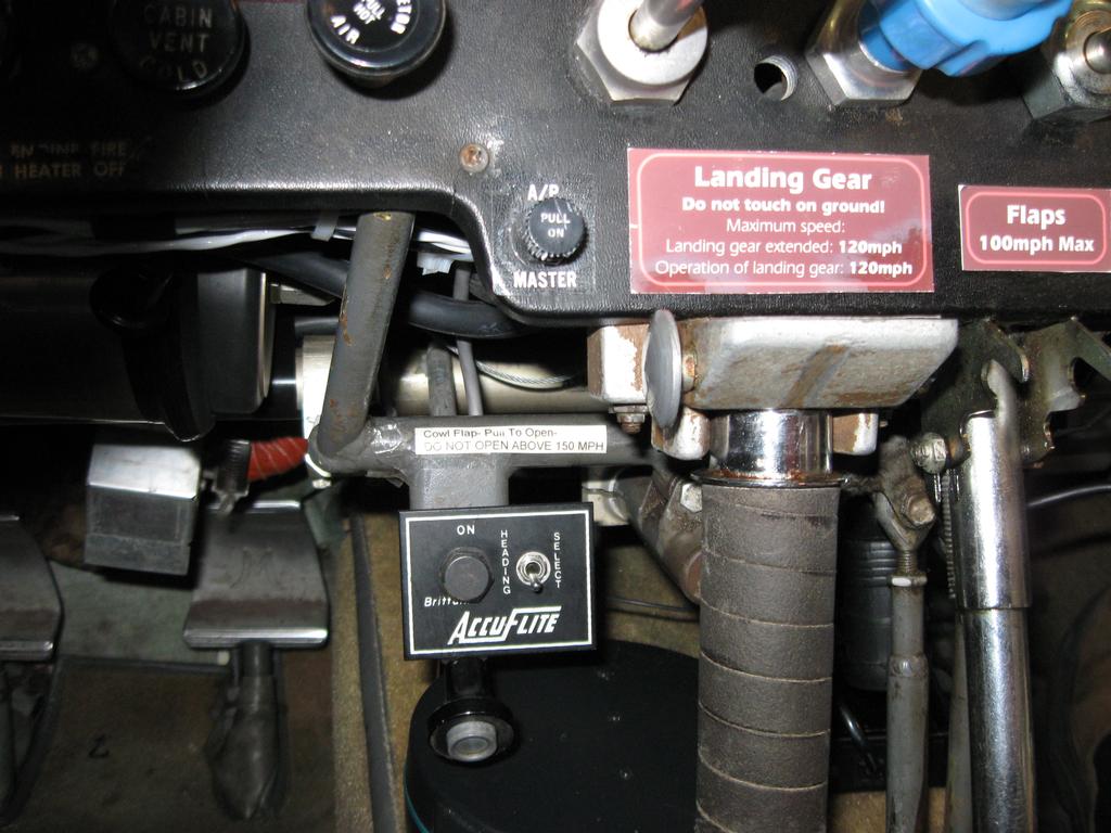 The AccuFlite 'Heading Select' toggles between simple wing-leveler BSS (down) and AccuFlite (up). Visible above it is the master autopilot on-off switch (push-pull control valve actually), labeled A/P MASTER. This is the button that used to be on the yoke in the Mooney PC system and typically had a thousand rubber bands to turn it off.