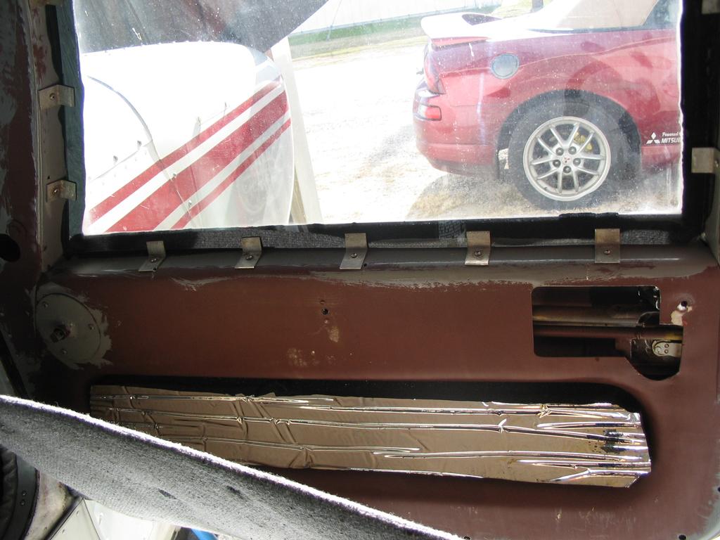The carpeted panel can be pried loose with a screwdriver. Plastic gizmos latch into holes in the metal door and can be popped in and out easily.