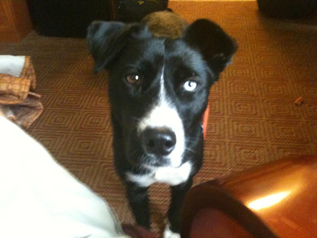 On oxygen between OKC and Mobile AL. The canvas travel crate takes up the entire back seat, and Millie is comfortably resting inside it.