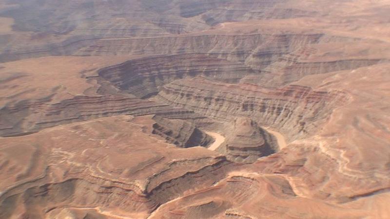 Gooseneck State Park, where the San Juan river twists and turns in sandstone formations, showing hundreds of layers as the river meanders toward the west into Lake Powell.